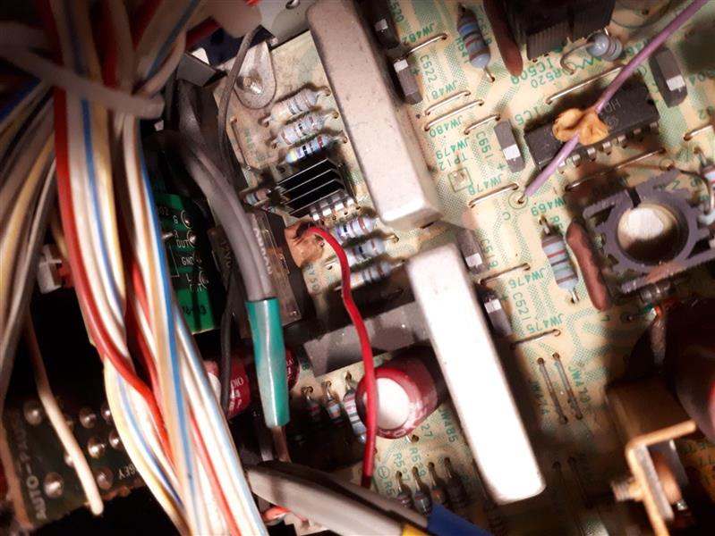 NE5532P versterker IC helemaal gecorrodeerd, door het koperen koelblokje eromheen. De pootjes breken zo af, ik gok/hoop dus dat dit de boosdoener is dat er geen geluid te horen is.